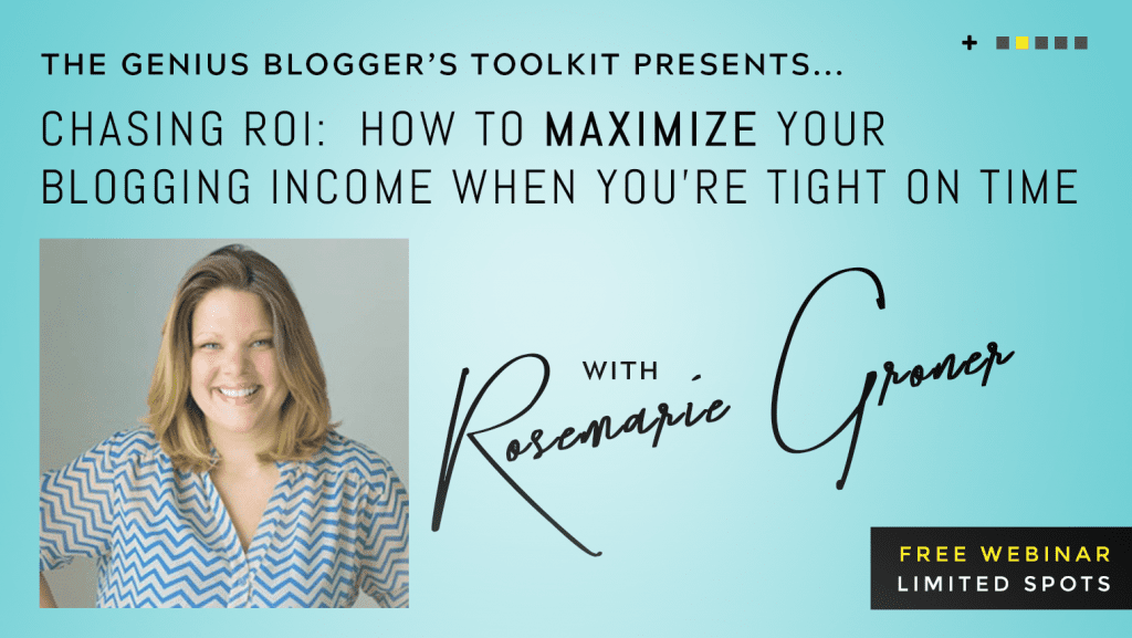 If you’re ready to start making better money for the time you put into your blog, you’ll want to check out Rosemarie Groner’s webinar on “Chasing ROI: How To Maximize Your Blogging Income When You’re Tight on Time.” This webinar (Thursday at 7pm ET) will show you where to spend your time to have the greatest impact on your revenue.